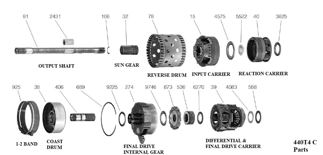 GEAR, REVERSE DRUM, INPUT CARRIER, REACTION CARRIER, 1-2 BAND, COAST