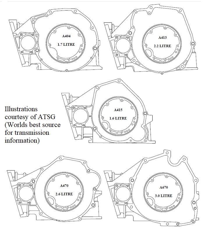 A404 Also known as 30TH (A404-1.7L); 31TH (A413-2.2L); 31TH (A470-2.6L); 31TH (A670 various engines). Versions of this transmission were used from 1978 to present. There were MANY variations over the years and MANY parts do NOT interchange from year to year or model to model. DO NOT confuse it with the overdrive A604. Top cooler line is the cooler return line. Band adjustments: * my preference (not the factory specified)