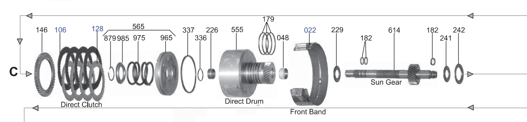 DIRECT CLUTCH, DIRECT DRUM, FRONT BAND, & SUN GEAR |