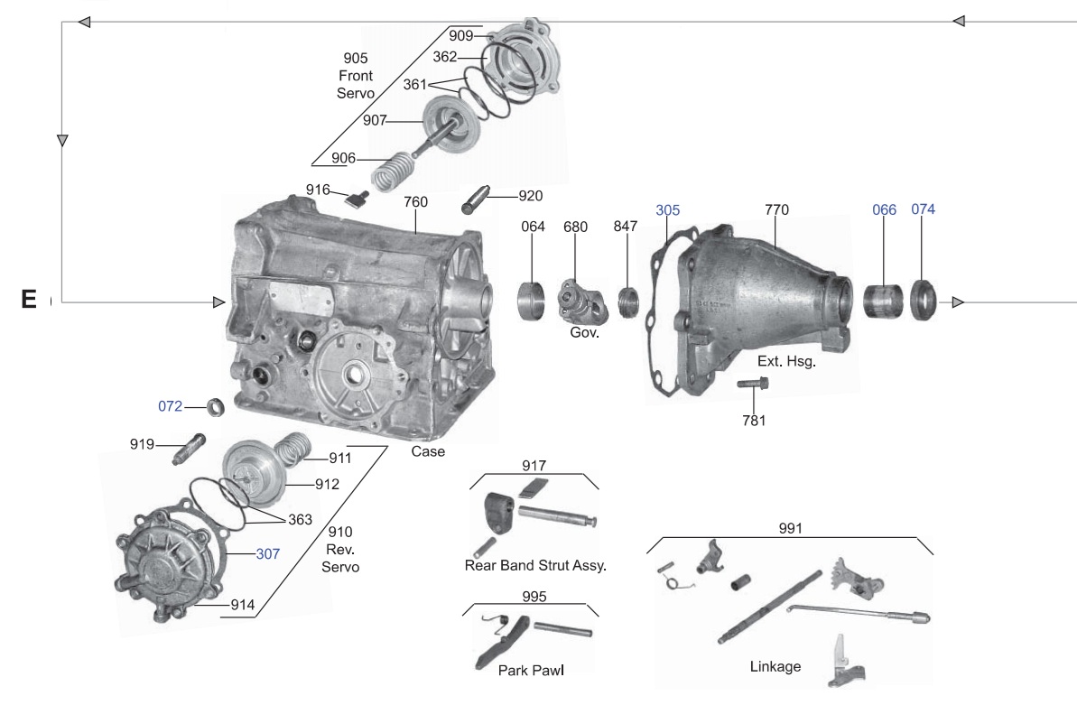 REAR SERVO, REAR BAND STRUT ASSEMBLY, PARK PAWL, LINKAGE, & CASE |