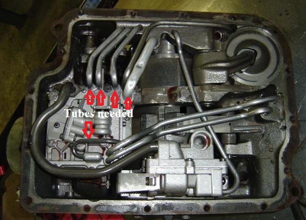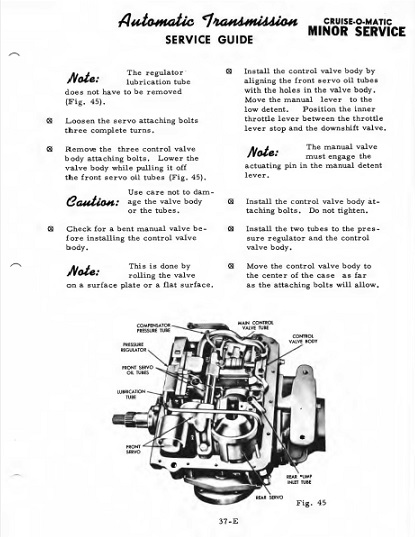 kick-down valve. 14. Install the three 7/16" head bolts that hold the valve body to the case and torque them to 65 inch-pounds. 15. After sliding the valve body section back onto the two tubes, make sure you start all four screws and all four bolts BEFORE you tighten any